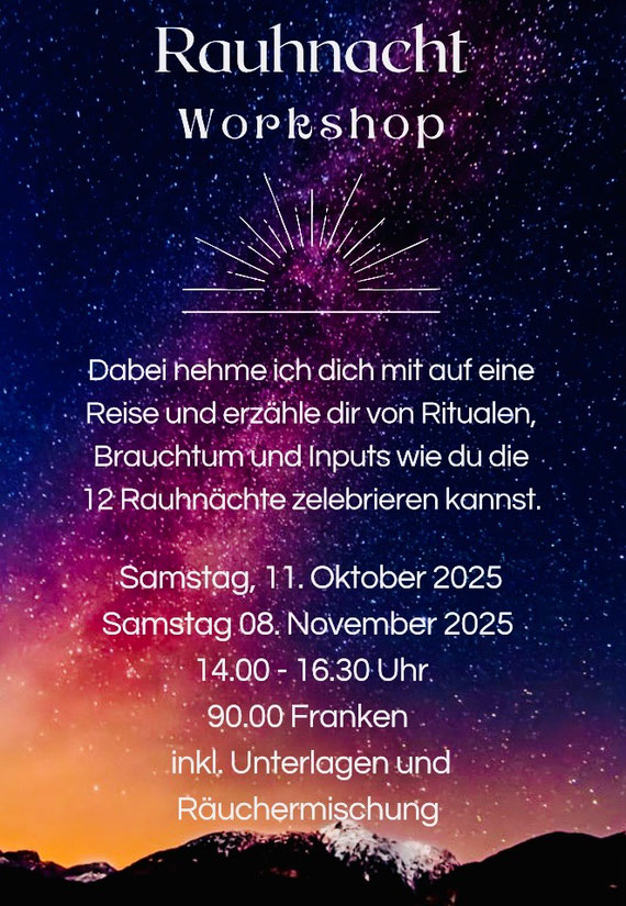 Gerne lade ich dich ein zu diesem inspirierenden Workshop. Dabei erzähle ich was es mit den Rauhnächten auf sich hat, über den Brauchtum, wie man diese Zeit
